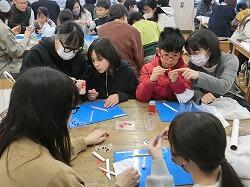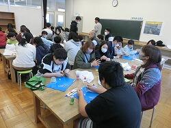 外国語の授業です。パフォーマンステストに向けて、やりとりができるように単語を確認したりペアで練習を行ったりしていました。