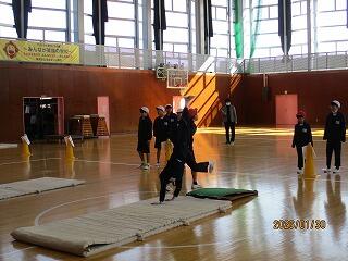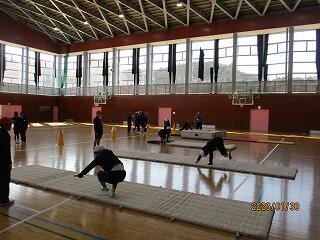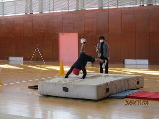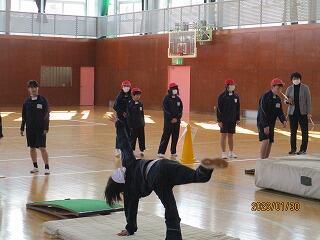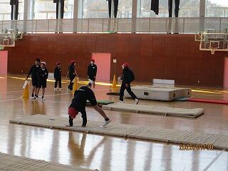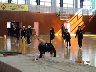 今日は、側方倒立回転の技のポイントを知り、自分の課題を克服するために練習方法(場所)を選んで練習に取り組んでいました。友達にアドバイスをしてもらったり、動画で確認したりしながら頑張る姿がみられました。