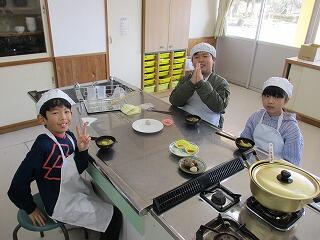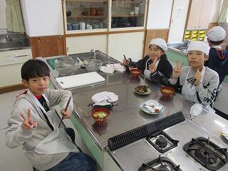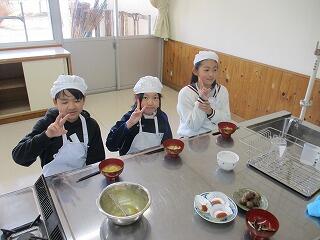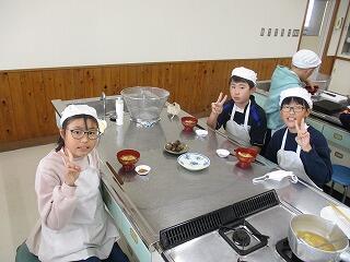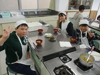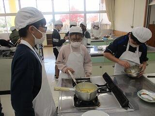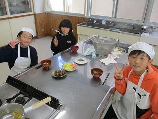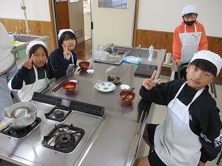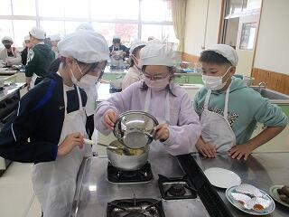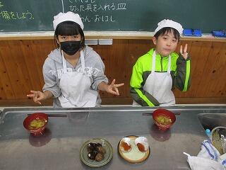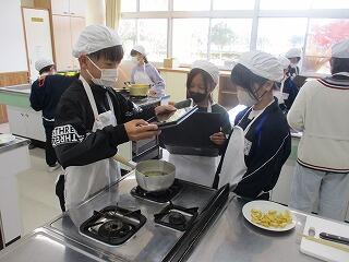 今回は、学校の農園で収穫したサツマイモまたは里芋を使ったみそ汁を調理しました。どの班も友達と役割分担をし、協力して手際よく調理することができました。