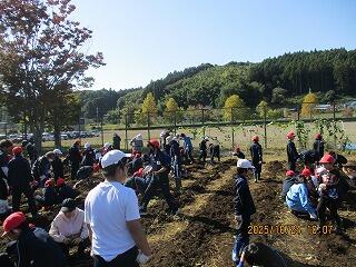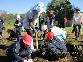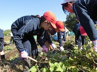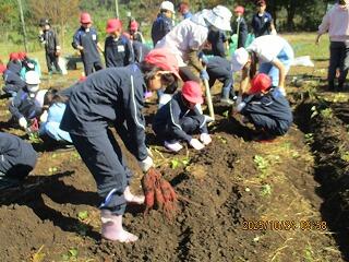 本日、さつまいも掘りをしました。多くのボランティアの方が参加してくださり、子供たちといっしょにつる切りやさつまいもの収穫をしてくださいました。