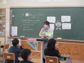 健康な体をつくるために野菜のはたらくを知り、苦手な野菜でも少しずつ食べられるようになることをめあてに大島教諭と担任によるT・Tで授業を行いました。振り返りでは、「苦手な野菜でも少しは食べてみよう」「これからは残さず完食しよう」と前向きな意見を発表していました。