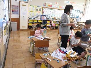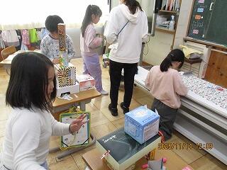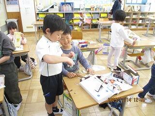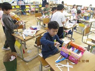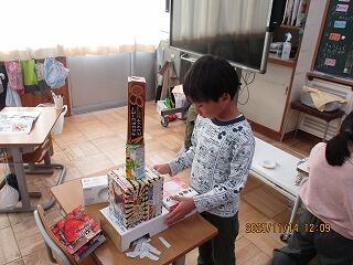 いろいろな形の箱を組み合わせて、動物や建物などを自由に作っていました。子供らしい発想豊かな工夫がされていて素敵な作に仕上がりました。