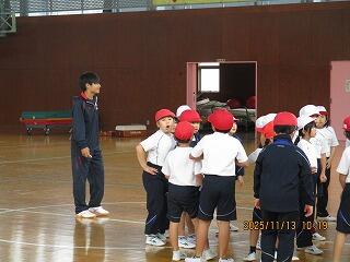 休み時間になると多くの子供たちに大人気で、いっしょに遊んでいる姿が見られました。よいお兄さんとして一日、学習や生活、給食指導等の補助に入り、教員の仕事の一部を体験しました。