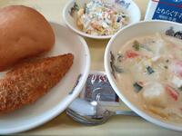 セルフフィッシュバーガー(丸パン、白身魚フライ、コールスローサラダ、ソース)、牛乳、鶏肉と野菜のクリーム煮