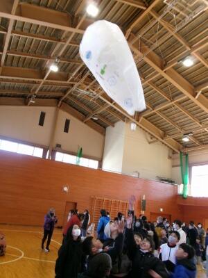 2月20日ふれあい熱気球教室が開催されました。気温差が大きい方が熱気球が高く飛ぶとのことで寒い中の作業となりましたが、子どもたちは思い思いの絵を描き、気球が高く上がった時には自然と拍手がおこりました!最後に気球の中に入り、子どもたちは大興奮でした。参加していただいた保護者の皆様、ありがとうございました。