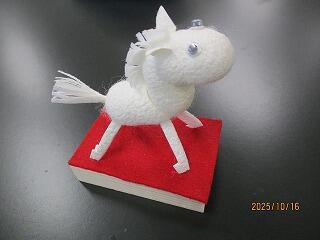 繭玉を用いて、来年の干支の「馬」を作りました。