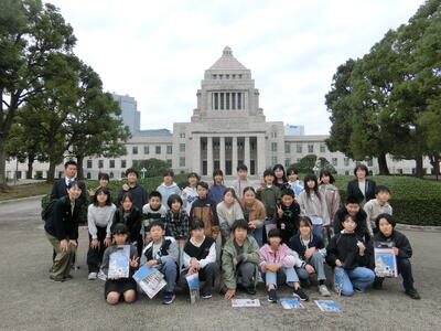 今、ホテルを出発しました。二日目最初の見学先は、社会科で学習した国会議事堂です。