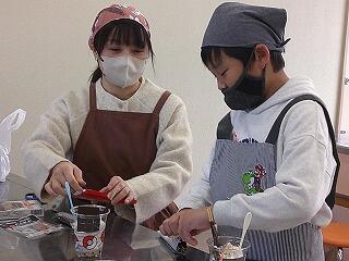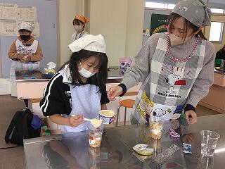 4年生はパフェづくりを行いました。カップのデコレーションから楽しみ、親子で相談しながら好きなも