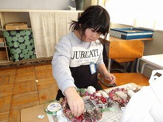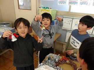 松ぼっくりやモール、毛糸など、好きな材料を持ち寄って楽しそうに飾り付けていました。