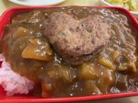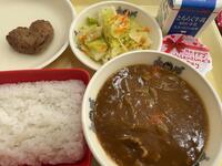 ごはん、牛乳、ハンバーグカレー(ハンバーグ、ポークカレー)、