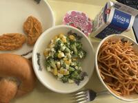 米粉パン、牛乳、ミートソーススパゲティ、ナゲット、