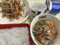 ごはん、牛乳、わかめふりかけ、きんぴらつくね、しもつかれ、根菜のごま汁