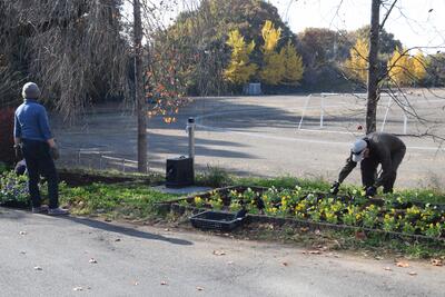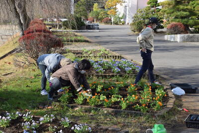 本校の地域コーディネーターである三森紀子さんを中心に、地域の皆様5名が校舎前の花壇にパンジーを植えてくださいました。