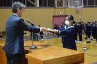 式では、卒業生一人一人が校長から卒業証書を受け取りました。校長式辞では、「『自分像』をしっかりと思い描き、自分に秘められた強さを信じ、あきらめず、目標に向かって努力を続けてほしい。」との励ましの言葉がありました。