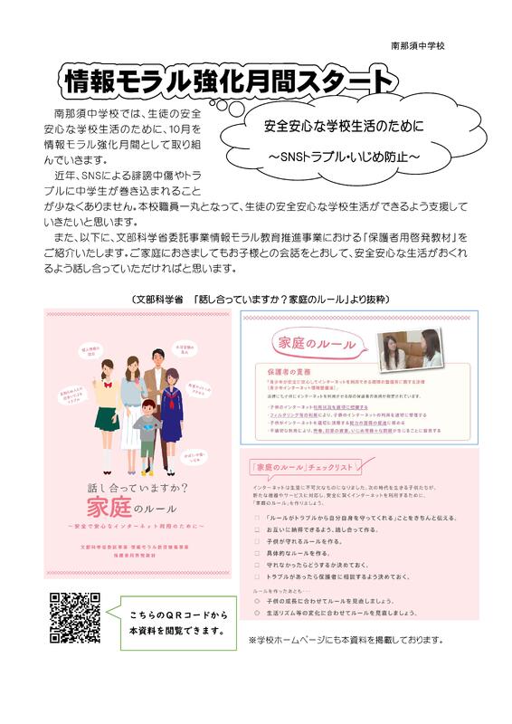 南那須中学校では、生徒の安全安心な学校生活のために、10月を情報モラル強化月間として取り組んでいきます。
