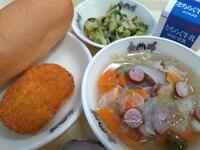 はちみつパン、牛乳、牛肉コロッケ、ブロッコリーサラダ、野菜とウインナーのスープ