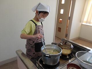 みそ汁は班ごとに具材を相談し、和風や洋風それぞれおいしそうな色合いで仕上げていました。