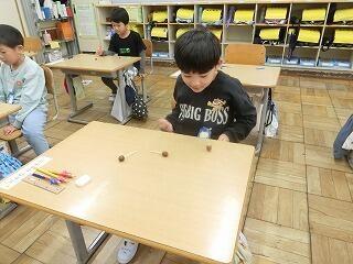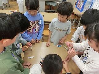 子どもたちはよく回るよう、指した爪楊枝の長さを調節したり、回し方を教え合ったり